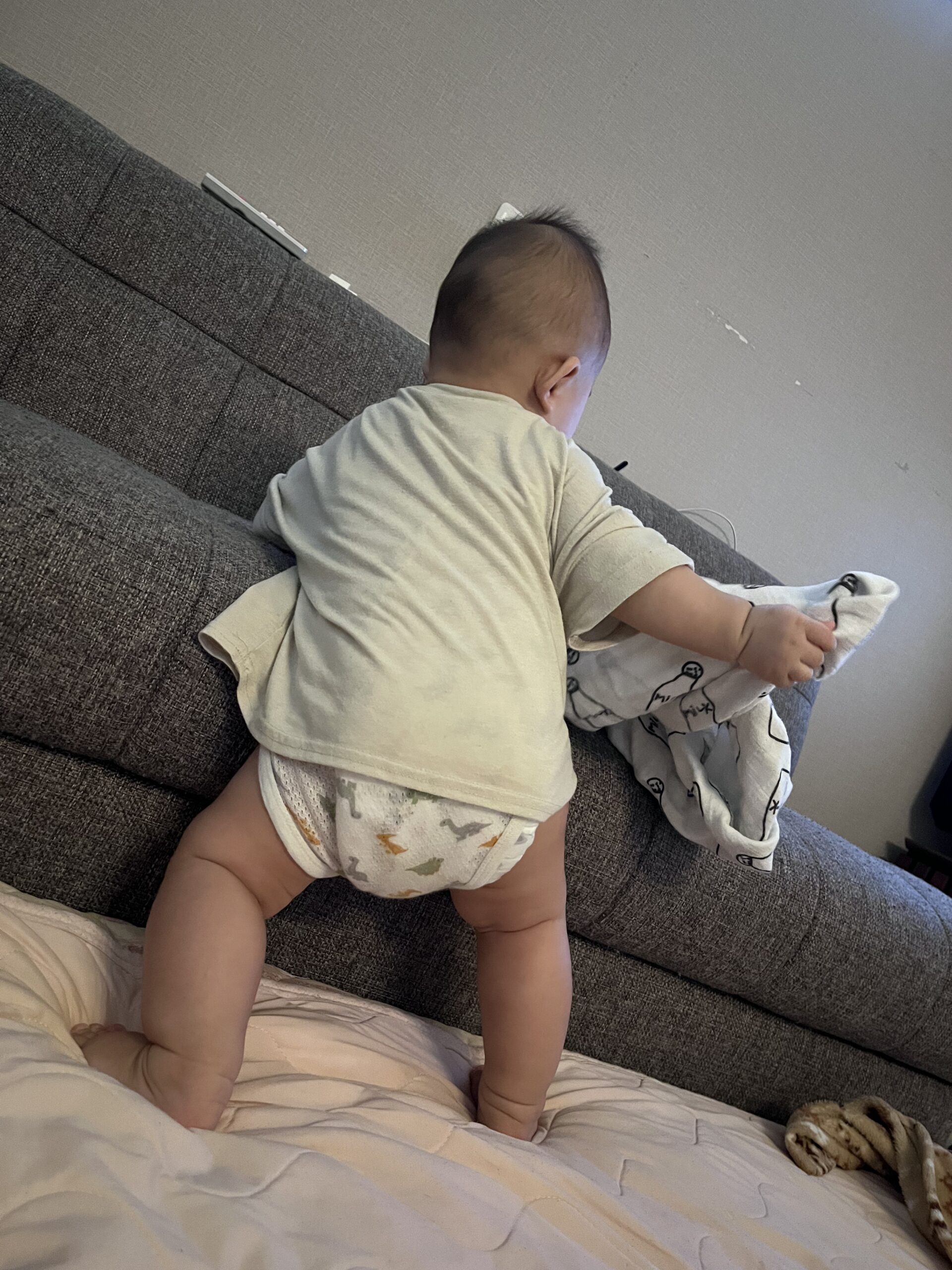 7ヶ月になる少し前からつかまり立ちをし、7ヶ月入ってからつたい歩きを始めました。おもちくんの時はもっと遅かったんだけどなぁと夫と話していて気づいたことが!